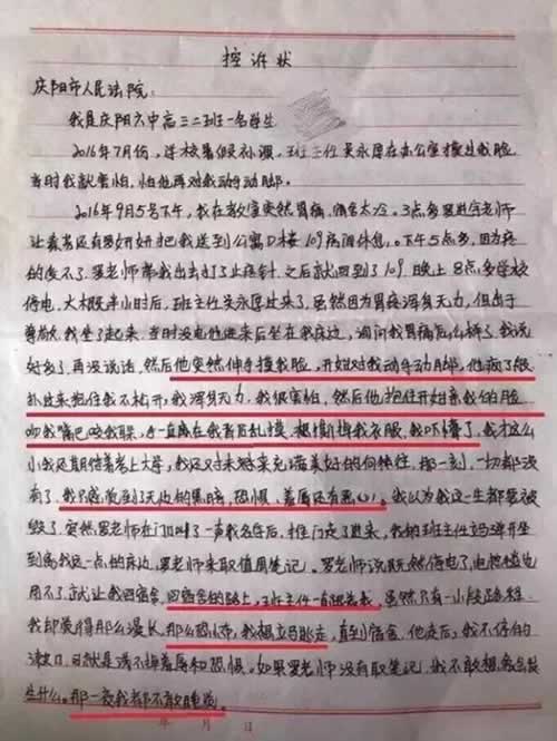 事发后,李明曾到女儿就读的庆阳六中了解情况,但当时李依依并未告诉他具体发生了什么。不过李依依在后来所写的控诉中提到,事发第二天,也就是2016年9月6日,班主任吴某某曾向她道歉,“他告诉我他错了,说是他糊涂,一时冲动,求我给他一条路”。
