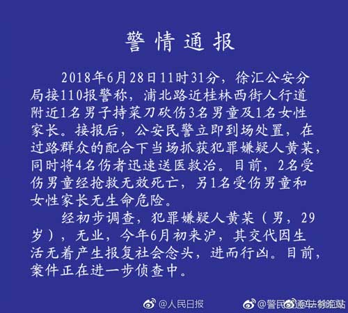 2018年6月28日11时31分,徐汇公安分局接110报警称,浦北路近桂林西街人行道附近1名男子持菜刀砍伤3名男童及1名女性家长。接报后,公安民警立即到场处置,在过路群众的配合下当场抓获犯罪嫌疑人黄某,同时将4名伤者迅速送医救治。目前,2名受伤男童经抢救无效死亡,另1名受伤男童和女性家长无生命危险。