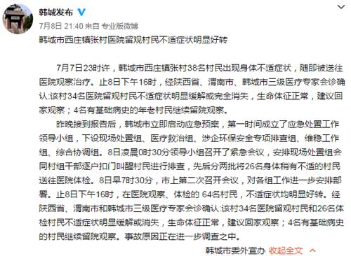 截止8日下午16时,在医院观察、体检的64名村民,不适症状均明显好转。经陕西省、渭南市和韩城市三级医疗专家会诊确认:该村34名留院观察的村民和26名体检村民不适症状明显缓解或消失,生命体征正常,建议回家观察;4名有基础病史的村民继续留院观察。事故原因正在进一步调查之中。