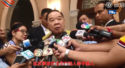 7月9日上午10:00左右,泰国副总理兼国防部长巴逸面对记者追问,如此回应普吉翻船事故:“中国人不听劝,不顾警告执意出海,所以责任发生他们要自己解决。这件事完全是中国人害中国人,关泰国什么事?完全是他们的责任。”(泰国头条新闻)