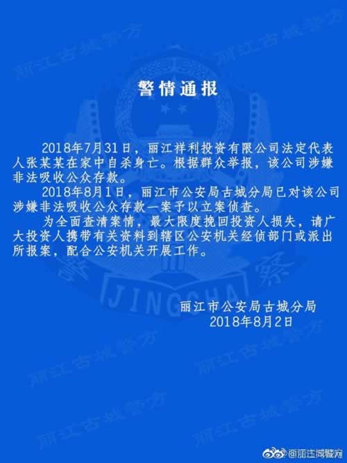 “7月31日,丽江祥利投资有限公司法定代表人张某某在家中自杀身亡。”8月2日,云南丽江古城警方发布了一则警情通报。