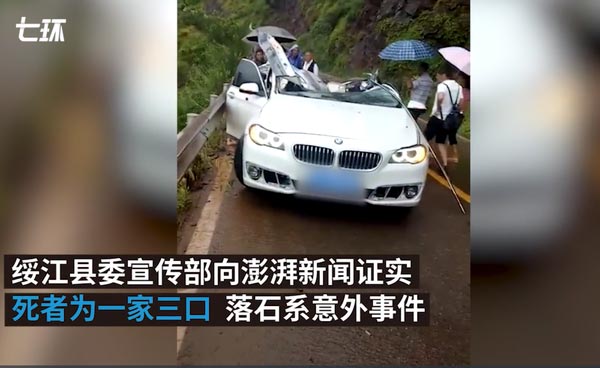 8月22日,云南昭通。一辆川牌宝马车行至三渡村附近,被落石砸中,车内3人身亡。绥江县委宣传部一名负责人向澎湃新闻证实,车内为一家三口,系落石引起的意外事件。
