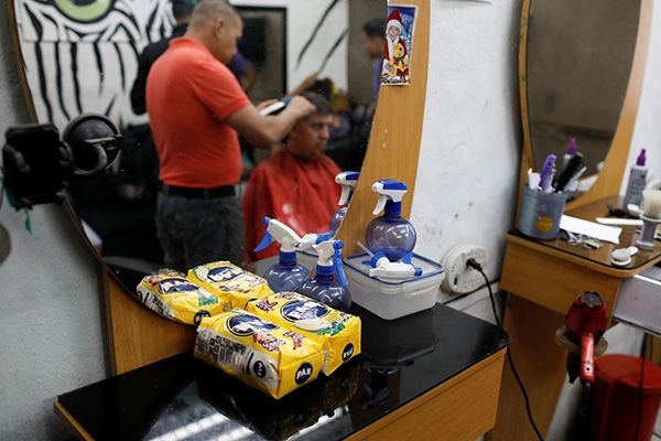 6月29日,委内瑞拉首都卡拉卡斯,一名男子用玉米粉作为理发的交换物。