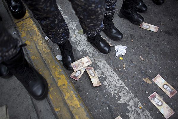 8月16日,在一场抗议活动中,百元面值的旧版货币“强势玻利瓦尔”像废纸一样被丢在地上。