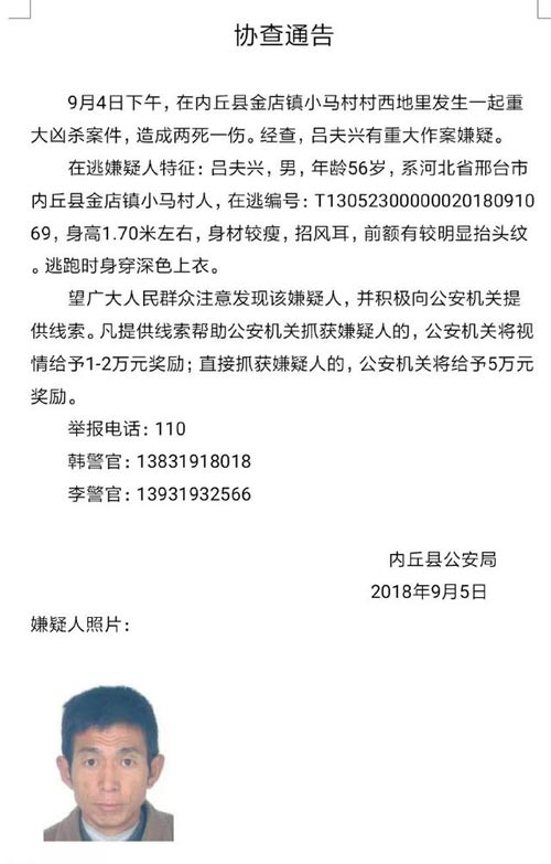 9月4日下午,在邢台内丘县金店镇小马村村西地里,发生一起重大凶杀案件造成两死一伤。经查,吕夫兴有重大作案嫌疑,目前在逃。