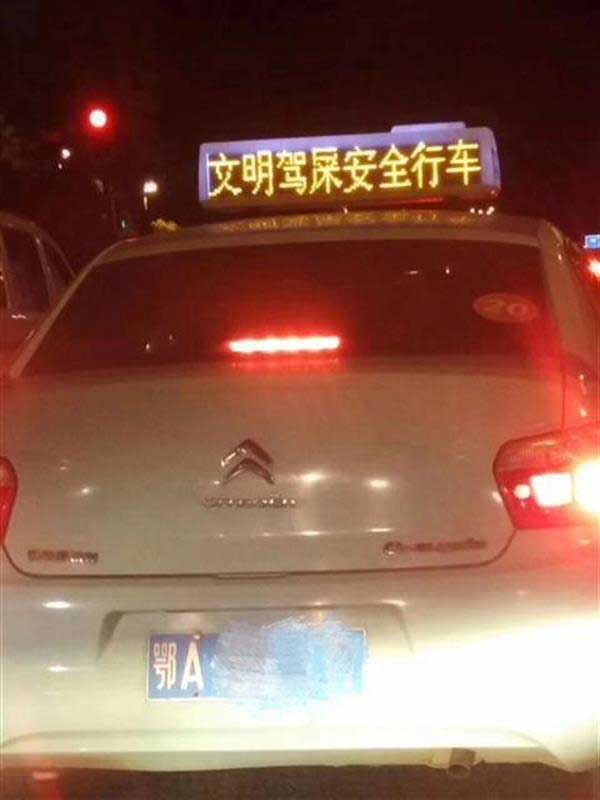 今日上午9时许,楚天都市报记者看到了网络上流传的照片,照片中一辆车牌号码为鄂AX***7的出租车,正在路口等候红绿灯,只见该车车顶上安装了一块广告屏,此时屏内显示的滚动字幕为“文明驾屎安全行车”。
