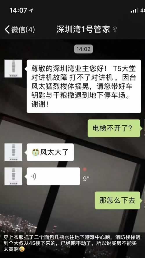 甚至深圳第一豪宅——深圳湾壹号的业主,也只能步行下楼梯,在摇晃的楼体中,乖乖躲在自家地下停车库,等待山竹过境。很多业主从45楼往下跑,边跑边后悔买的太高,到地下室已经是汗流浃背。