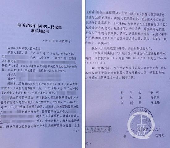 今年6月28日,咸阳市中院一审以犯故意伤害罪,判处王浪有期徒刑九年。