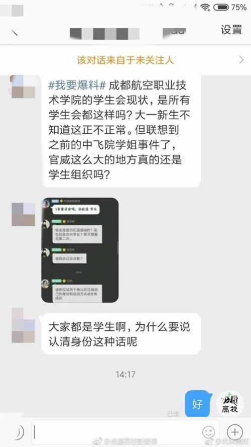 近日,有网友爆料:成都航空职业技术学院学生会同学在群里问“7号要开会吗”,并@了学长,紧接着群管理员跳出来提醒她,请注意自己的干事身份和说话方式。