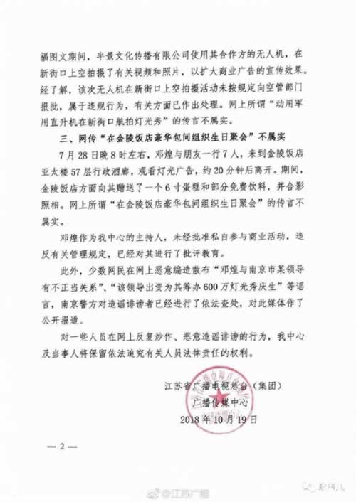 回应称,网传“邓煌过生日当晚花费600万做灯光秀”不属实、网传“动用军用直升机在新街口航拍灯光秀”不属实、网传“在金陵饭店豪华包间组织生日聚会”不属实。