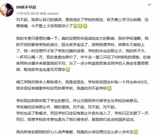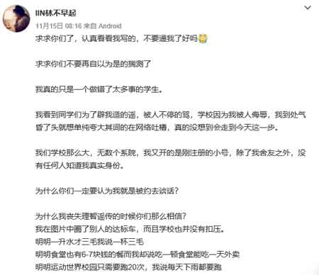 另一篇长微博是11月15日08:16发出的,@lIN林不早起称:我夸大事实并抹黑了学校已经愧疚到了极点了,希望键盘侠们多去了解事情真相,不要再逼我了。以下为长微博原文: