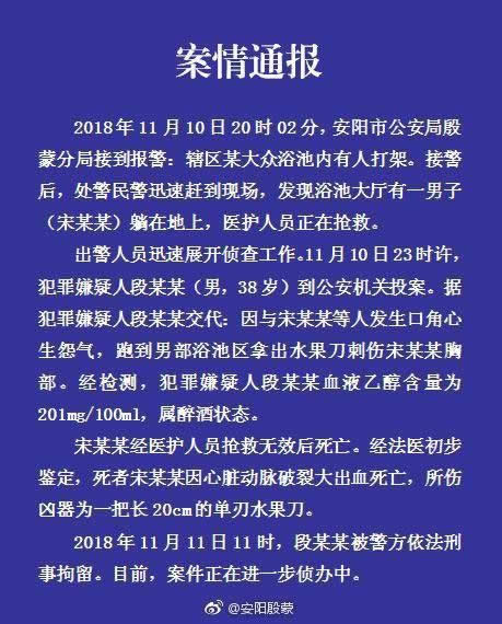 通报称,2018年11月10日20时02分,该分局接到报警:辖区某大众浴池内有人打架。接警后,处警民警迅速赶到现场,发现浴池大厅有一男子(宋某某)躺在地上,医护人员正在抢救。