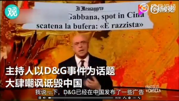 11月23日,意大利电视台Nove每周五晚上9点黄金时间模仿秀节目“Fratelli di Crozza”借D&G事件大肆嘲讽中国,还对D&G的道歉视频进行恶搞,说中国人是日本人,中国吃狗肉,随地吐痰等等……