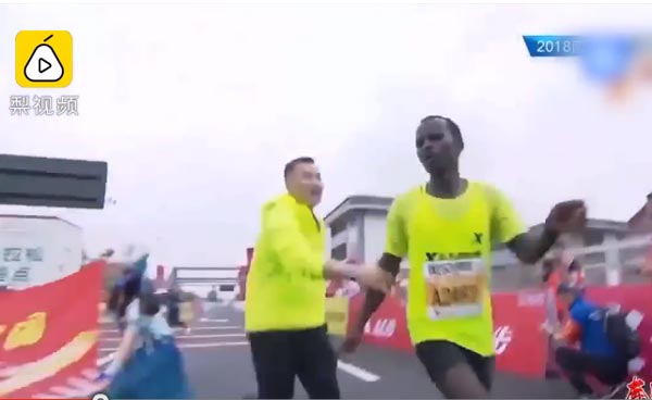 实拍南宁马拉松选手撞线夺冠后被拽停现场视频