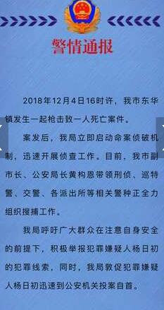 12月4日,广东省英德市东华镇发生一起枪击致1人死亡案件。案发后,嫌疑人杨日初在逃。目前,警方正在全力搜捕犯罪嫌疑人,并发布悬赏公告称,将对提供准确信息抓获犯罪嫌疑人的市民将给予10万元奖励。