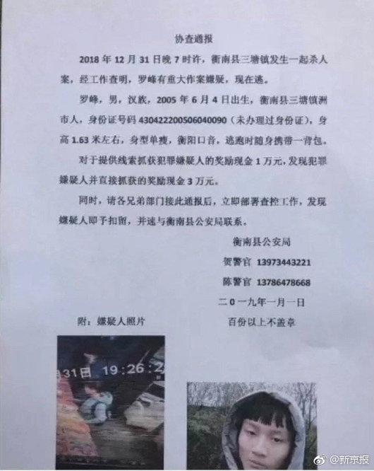 北京青年报记者1日下午从湖南衡阳市公安局了解到,2018年12月31日晚,衡南县三塘镇发生一起杀人案,一名2005年出生的嫌疑人在杀害父母后逃离。北京青年报记者随后从警方通报看到,“2018年12月31日晚7时许,衡南县三塘镇发生一起杀人案,经工作查明,罗峰有重大作案嫌疑,现在逃。罗峰,男,汉族,2005年6月4日出生,衡南县三塘镇洲市人,身份证号码430422200506040090(未办理过身份证),身高163厘米左右,身型单瘦,衡阳口音,逃跑时随身携带一背包对于提供线索抓获犯罪嫌疑人的奖励现金1万元,发现犯罪嫌疑人并直接抓获的奖励现金3万元。”据民警介绍,该名嫌疑人目前还在逃。