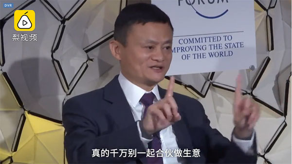 1月23日,马云在2019冬季达沃斯论坛上建议年轻人不要和朋友合伙做生意。因为他曾见过很多同学在合伙后不仅友谊没了,生意也失败了。他认为现在很多公司创始人之间都会闹矛盾,而阿里的18个创始人关系很好。