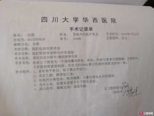 7月24日,任女士在四川大学华西医院进行了“腹腔包块切除术+腹腔脓肿引流”手术,手术记录单显示:手术发现患者左下腹查见一不规则囊性肿块,质软,局部与患者左侧腹壁 ,左侧附件,子宫圆韧带紧致粘连,内含大约300ml黄色脓性物质及纱布一块。红星新闻记者看到,任女士的出院记录显示,医院诊断为腹腔脓肿伴脓肿内纱布遗留。