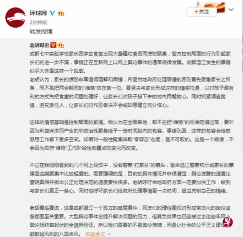 原标题:胡锡进评成都学校食安事件:当地不应把维稳放第一