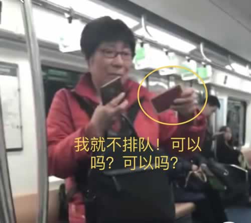 排队是文明的体现,大妈乘车不排队引起同车一女子不满,面对指责,大妈径直走向指责者,边走边伸手从包内掏出一红色证件,大呼道“我就不排队,怎么着?!”,紧接着大妈将证件怼到女子脸上并不停问“可以吗?!可以吗?!”。