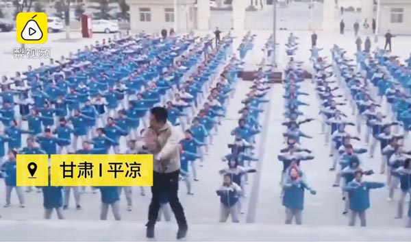 近日,甘肃平凉一实验中学课间操,张冠男老师带领全校400名学生跳改编的网红舞蹈。张老师称,从去年开始就教孩子们这些东西了,孩子们的思想受互联网的影响,都不喜欢传统的广播操,他们现在更喜欢动感的东西。
