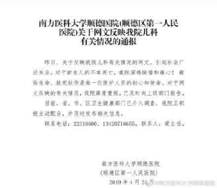 新京报快讯24日,南方医科大学顺德医院在官微发布“关于网文反映我院儿科有关情况的通报”,称对于新生儿的死亡深感惋惜和痛心,目前,省、市、区健康部门已介入调查。