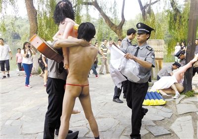 昨日16时05分,北大未名湖花神庙毗邻的小山上,突然冲出两名裸体男子,两人身上仅穿红色丁字裤,胸部写有黑色毛笔字,各自一手抱着充气娃娃,一手抱着吉他,身上挂着小救生筏,一同向未名湖方向冲去。 在离湖边十多米远的地方,两人被守候在附近的北大保卫部安保人员阻拦,一男子被按倒在地,另一人被保安牢牢抱住。安保人员找来两块白布,搭在两男子及充气娃娃身上。见有围观者拍照,两名男子脸上还露出笑容。