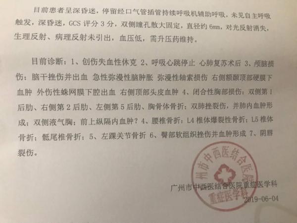 该家属称,妹妹自住院以来,在ICU(重症监护室)花费已近10万元,医疗费目前由学校垫付。他向澎湃新闻提供的医疗诊断单显示,患者目前为创伤失血性休克,颅脑损伤,未见自主呼吸触发,深昏迷。