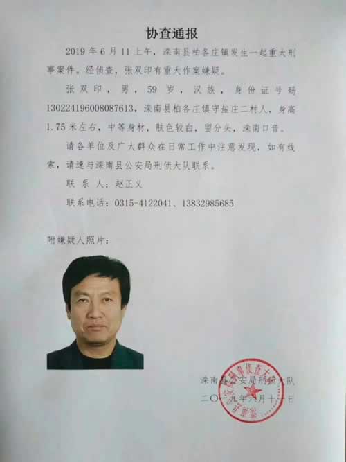 6月11日,河北唐山滦南县公安局刑侦大队发布协查通报称,6月11日上午,滦南县柏各镇发生一起重大刑事案件,经侦查,张双印有重大作案嫌疑。通报显示,张双印,男,59岁,汉族,滦南县柏各镇守盐庄二村人。