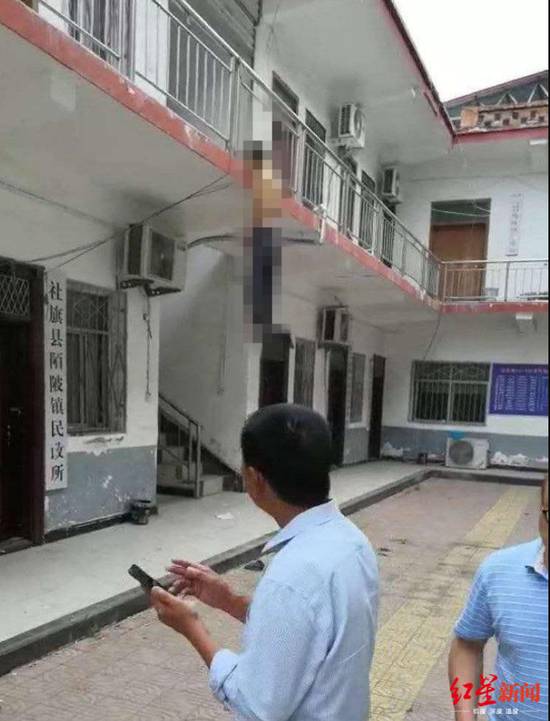 有网友爆料称,6月16日上午,一男子在河南南阳社旗县陌陂镇民政所自缢身亡。网传视频显示,该男子上身赤裸,头悬于二楼阳台外。