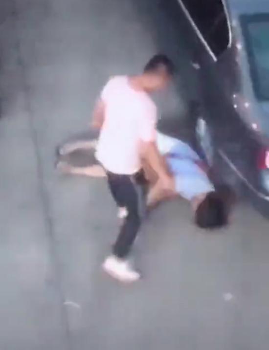 这段15秒的视频显示,一名身着淡蓝色白色短裤的女子从黑色车辆下车后,尖叫一声倚靠车辆坐在地上,身旁着白色短袖的年轻男子上前用右脚使劲踢踹女子头部共3下,可明显听见踢踹声,致使女子倒地不起,随后是男子将其抱起的动作。