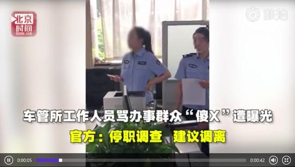【车管所工作人员骂办事群众“傻X”遭曝光 官方:停职调查 建议调离】18日,河南许昌一市民称,到车管所办理业务遭工作人员推诿,吐槽后被骂“傻X”,此事曝光后车管所领导电话致歉,并称对该工作人员予以停职、建议调离。但事发至今6天,许昌市交警支队督查室仍未作出处理结果。