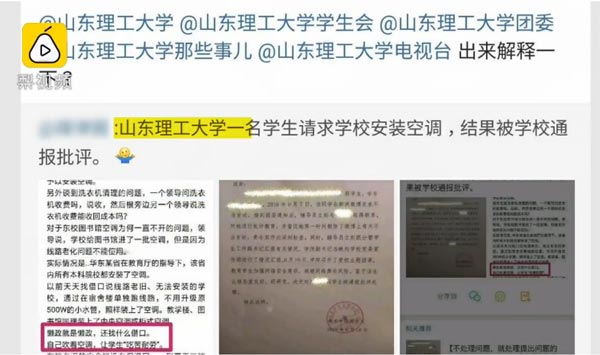 曝山东理工大学一学生因请求装空调被通报批评视频