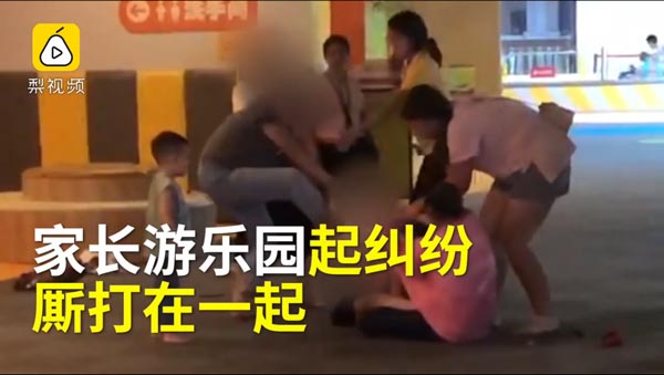 2019年8月8日, 河南漯河,一大型儿童游乐园内,3名家长发生纠纷,2名女子与另一女子当众撕扯在一起,倒地女子衣服都被扯破了。游乐园经理称,双方家长因为孩子抢玩具起冲突。目前,警方已介入调查。