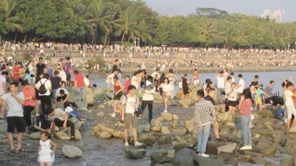 2019年10月2日,国庆假期第二天,深圳湾公园从人行道到海滩礁石上都挤满了人,一女孩说自己因怕出游遇拥堵所以留在深圳,却仍遇上人山人海;一名来自广西的游客也说,没想到国庆出游那么多人,“基本上就是看人”。