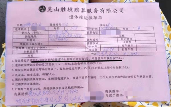 死者家属提供的“遗体接运派车单”显示,总计收费24640元。 受访者供图