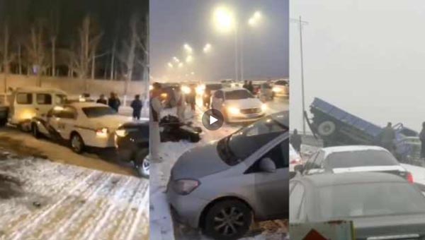 实拍河北降雪道路成溜冰场多车连撞成团视频