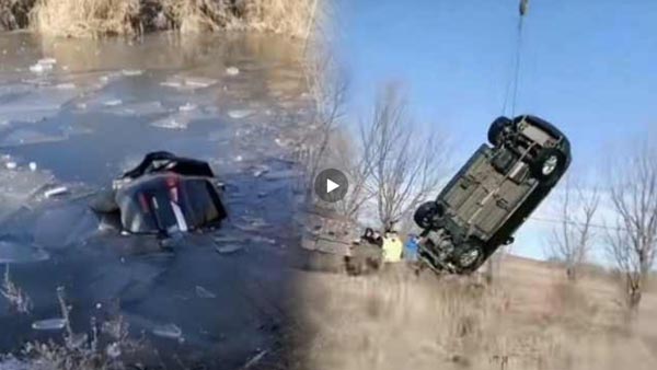 实拍辽宁一小车坠结冰水库被冻住车内3人遇难视频