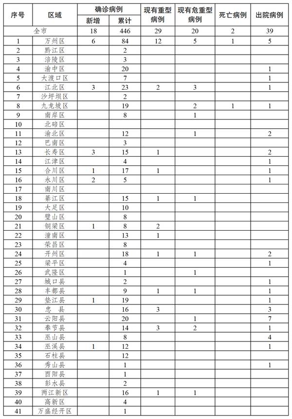 新增确诊病例中,万州区6例、江北区3例、长寿区3例、合川区1例、永川区2例、铜梁区1例、垫江县1例、巫溪县1例;新增重型病例中,万州区1例、合川区1例、潼南区1例、奉节县1例;重型病例转普通型病例中,璧山区1例、开州区1例、忠县1例、奉节县1例;重型病例转危重型病例中,江北区1例、九龙坡区1例、渝北区1例;危重型病例转重型病例为忠县1例;新增危重型病例为万州区1例;新增出院病例中,万州区1例、渝中区1例、九龙坡区1例、梁平区1例、忠县2例、云阳县2例。
