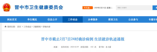 2月9日,山西省晋中市卫健委官网通报了该市截至2月7日24时确诊病例生活就诊轨迹。