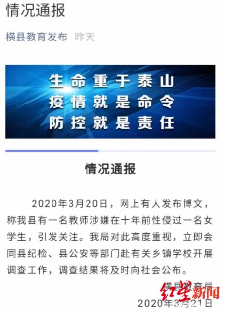 红星新闻记者注意到,21日下午,横县教育局发布通报称,2020年3月20日,网上有人发布博文,称该县有一名教师涉嫌在十年前性侵过一名女学生,引发关注。横县教育局对此高度重视,立即会同县纪检、县公安等部门赴有关乡镇学校开展调查工作,调查结果将及时向社会公布。