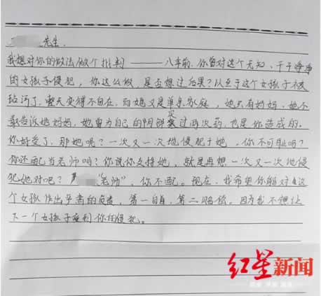 信中赵女士写道,“我想对你(邓某)的做法做一个批判,你曾经对一个无知的、干干净净的女孩子侵犯。你这么做是否想过后果?这个女孩子被玷污了,整天变得不自在,而她又是单亲家庭,她只有妈妈,她不敢告诉妈妈……你好受了,那她呢?一次又一次的侵犯,你不可耻吗?你还配当老师吗?现在我希望你能对这个女孩做出严肃的负责,我不想让下一个女孩子受到你的侵犯。”