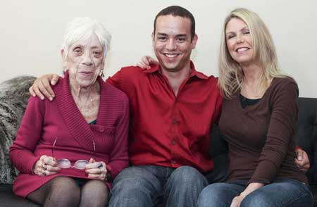 图为Kyle Jones携91岁女友与母亲(右)三人温馨照。