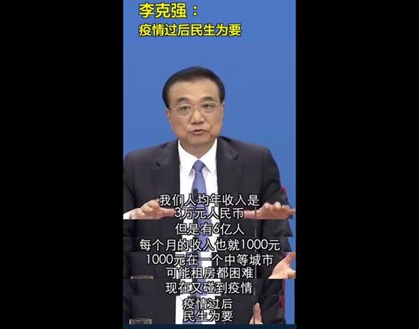 李克强指出,中国是一个人口众多的发展中国家,我们人均年收入是3万元人民币,但是有6亿人每个月的收入也就1000元,1000元在一个中等城市可能租房都困难,现在又碰到疫情,疫情过后民生为要。怎样保障那些困难群众和受疫情影响新的困难群众的基本民生,我们应该放在极为重要的位置,我们采取的纾困政策有相当一部分就是用于保障基本民生的。