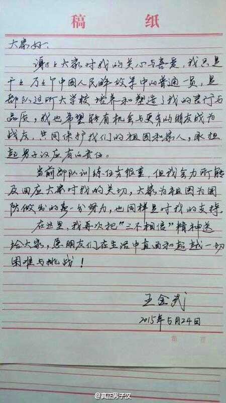 节目组表示,“王金武知道大家对他的喜爱后,在百忙中给大家写信”,信上王班长写道:“感谢大家对我的关心和喜爱,当前部队训练任务很重,但我会力所能及回应大家对我的关切。”还别说,这字儿写的挺漂亮的!
