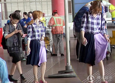 腾讯娱乐讯(赵阳阳/图文)日前,柳岩和大鹏这对好“闺蜜”一起现身首都机场,当天柳岩依旧是一头黄发搭配出镜率很高的白色圆框太阳镜,身穿一件黑白格子衬衫搭配个性的双色裙,虽然事业线包裹得严严实实,裙子看起来也过长了一些,不够清凉。但还是秀出了细长小腿和脚踝上的纹身,透露出点儿小性感,只是脚上一双地摊货一般的粉色厚底人字拖拉低了整身搭配的档次,女神秒变女汉子,大大咧咧的柳岩,在搭配细节上也太不走心了。