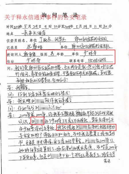 释正义披露更多举报材料,曝光释永信及“与释永信通奸女人”的公安笔录。文中记录了释永信向郑州市公安局反映刘姓女子敲诈他的情况。图片由举报人释正义提供。