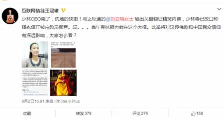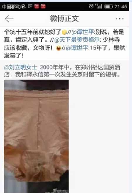 昨天下午,微博上流传一个名叫“刘立明女士”的微博爆料“2000年年中,在郑州裕达国贸洒店,我和少林寺方丈释永信第一次发生关系时留下的短裤。”从图片上来看,这条保存完整,而且十五年没洗。
