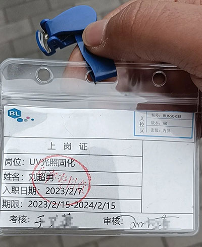 刘超男来这里打工,是通过劳务派遣的形式,与她签订合同的是实际是安徽林威德人力资源有限公司。上岗证显示,她的工种是“ UV光照固化”。