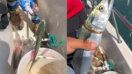 8月30日,山东青岛,灵山岛。一男子发视频称海钓上的鱼身上卡着金色镯子的视频引发网友关注。视频拍摄者陈先生表示,这条鲅鱼是旁边的鱼友钓上来的,当时镯子就直接在鱼身上卡着。陈先生称自己海钓5、6年了,也是第一次遇见这种事,目前鱼已放生。网友:钓友真是什么都能钓到。